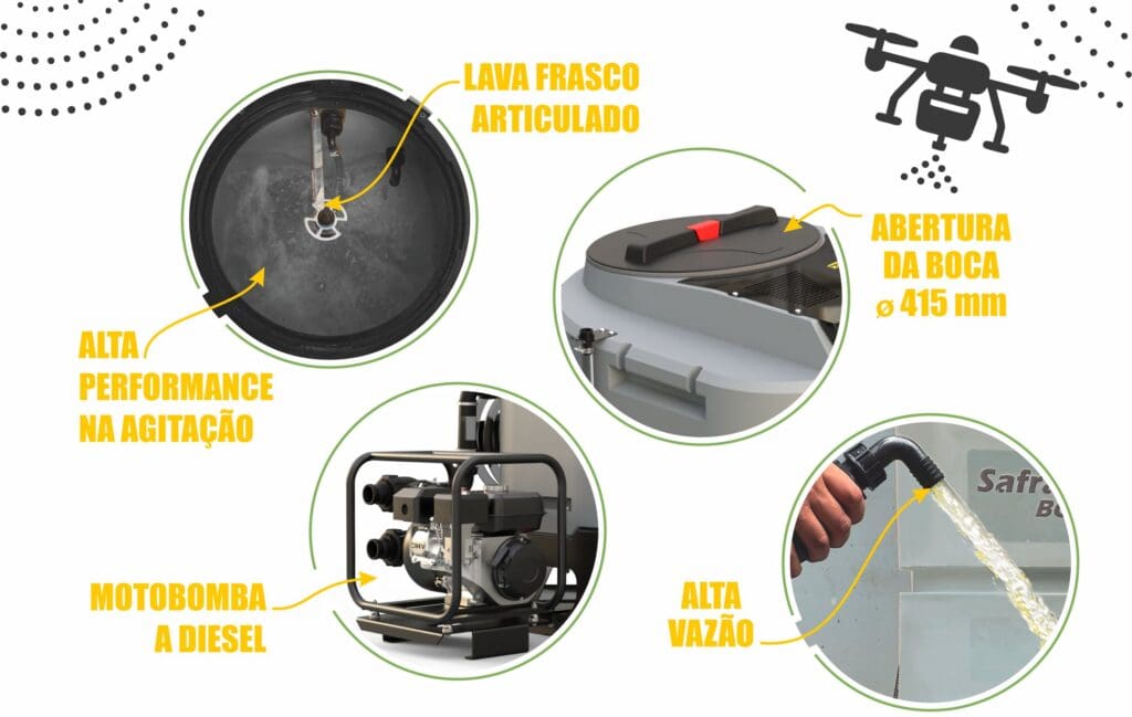 Tanque robusto, em plástico de alta resistência química e mecânica.