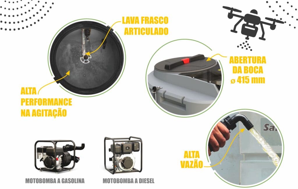 Tanque robusto, em plástico de alta resistência química e mecânica;